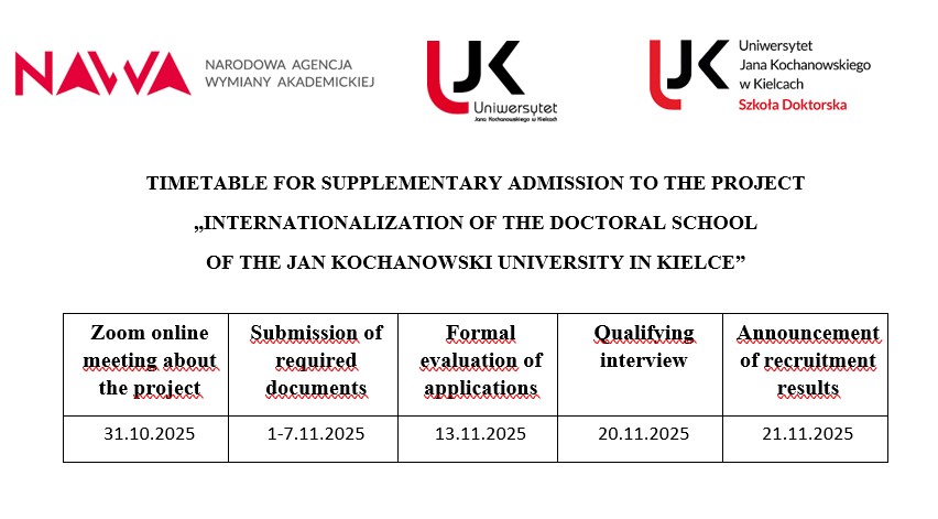 We announce the recruitment for the Project “Internationalization of the Doctoral School of Jan Kochanowski University in Kielce” with the number BPI/STE/2023/1/00014/U/00001, implemented by the Jan Kochanowski University in Kielce, under the STER NAWA Program – internationalization of doctoral schools.